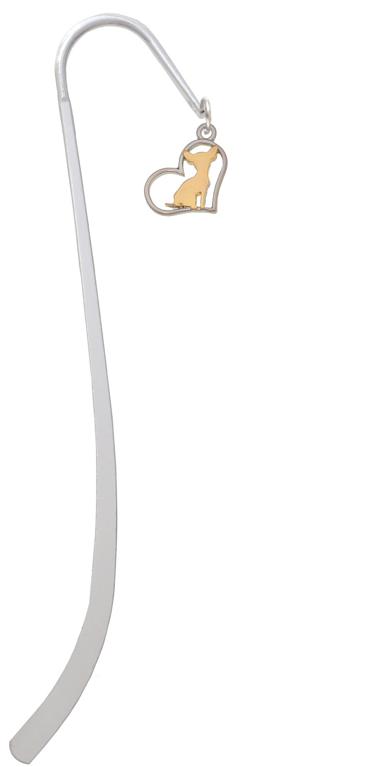 Two Tone Chihuahua Silhouette Heart Charm Bookmark. Two Tone Chihuahua Silhouette Heart is approx. 0.7 x 0.52 x 0.09 inches (HxWxD) including loop. Dog in cutout heart is the same on both sides. Silver Plated Bookmark is 5 inches long. Great Bible Gift or Torah Gift. Also available as a necklace, and bracelet. Please Note: Our products are lead safe, but are not intended for children 14 years and younger.