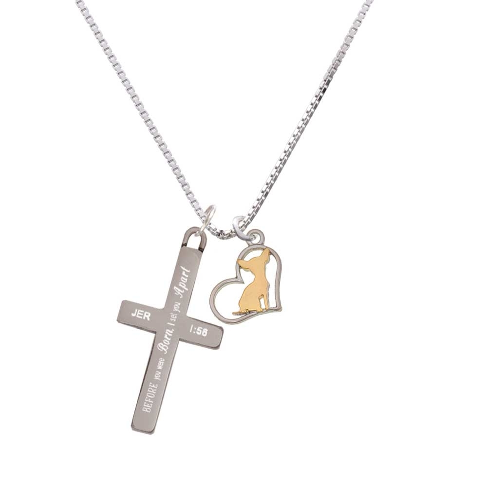 Two Tone Chihuahua Silhouette Heart – I Set You Apart – Cross Necklace. Two Tone Chihuahua Silhouette Heart is approx. 0.7 x 0.52 x 0.09 inches (HxWxD) including loop. Dog in cutout heart is the same on both sides. 1.3mm Box Chain necklace is 18″+2″ Extender. Lobster claw clasp. Stainless Steel Cross is approx. 1.3 inches long. Engraved Bible verse Jeremiah 1:56 – Before I formed you in the womb I knew you, before you were born I set you apart; I appointed you as a prophet to the nations. Please Note: Our products are lead safe, but are not intended for children 14 years and younger.
