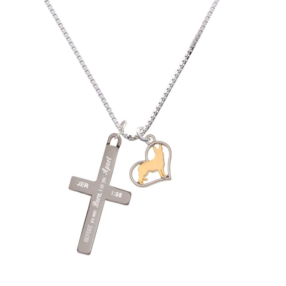 Two Tone German Shepard Silhouette Heart – I Set You Apart – Cross Necklace. Two Tone German Shepard Silhouette Heart is approx. 0.7 x 0.52 x 0.09 inches (HxWxD) including loop. Dog in cutout heart is the same on both sides. 1.3mm Box Chain necklace is 18″+2″ Extender. Lobster claw clasp. Stainless Steel Cross is approx. 1.3 inches long. Engraved Bible verse Jeremiah 1:56 – Before I formed you in the womb I knew you, before you were born I set you apart; I appointed you as a prophet to the nations. Please Note: Our products are lead safe, but are not intended for children 14 years and younger.