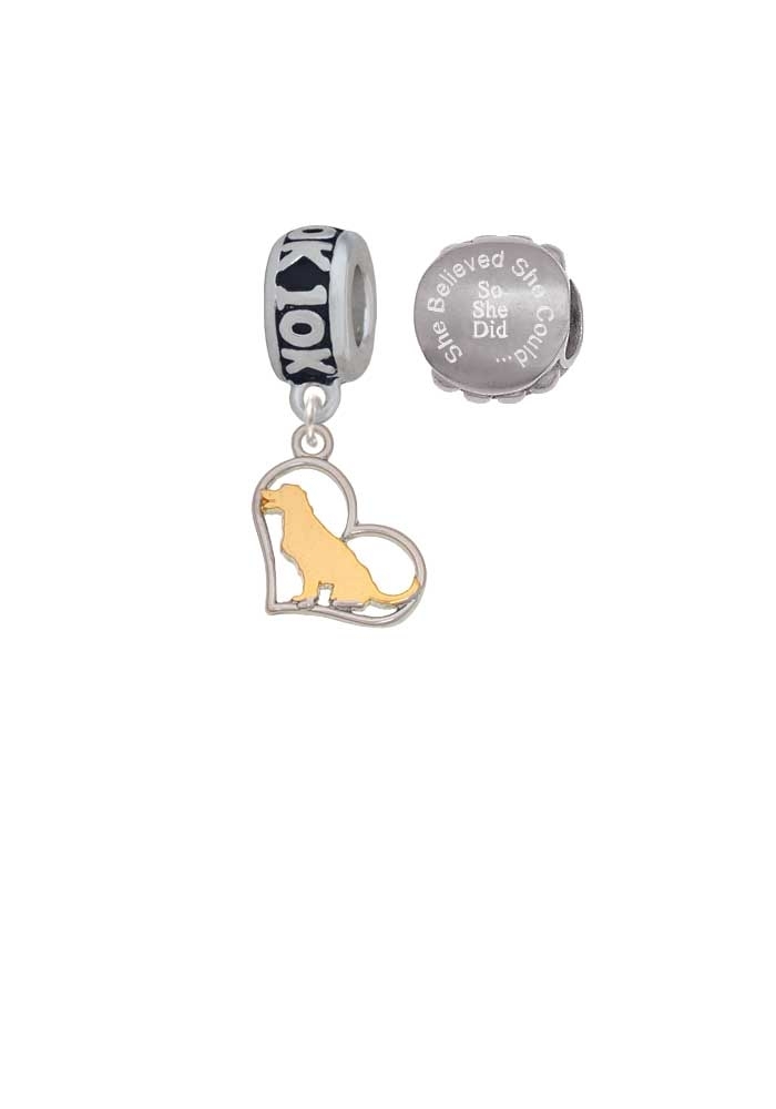 Two Tone Labrador Silhouette Heart 10K Run She Believed She Could Charm Beads (Set of 2). Two Tone Labrador Silhouette Heart is approx. 0.7 x 0.52 x 0.09 inches (HxWxD) including loop. Labrador Retriever Dog in cutout heart is the same on both sides. 10K Charm Hanger Bead is approx. 12x6x12 mm (HxWxD) Hole size: 5.5 mm. Our Charm Beads are compatible with most Charm Bead Bracelets. Also makes a great charms pendant. She Believed She Could So She Did Engraved Stainless Steel Bead is approx. 13x13x9 mm (HxWxD) Hole size 5.5 mm. Wonderful running jewelry beads. Please Note: Our products are lead safe, but are not intended for children 14 years and younger.