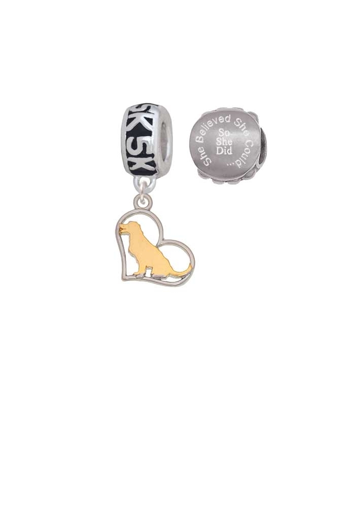 Two Tone Labrador Silhouette Heart 5K Run She Believed She Could Charm Beads (Set of 2). Two Tone Labrador Silhouette Heart is approx. 0.7 x 0.52 x 0.09 inches (HxWxD) including loop. Labrador Retriever Dog in cutout heart is the same on both sides. 5K Charm Hanger Bead is approx. 12x6x12 mm (HxWxD) Hole size: 5.5 mm. Our Charm Beads are compatible with most Charm Bead Bracelets. Also makes a great charms pendant. She Believed She Could So She Did Engraved Stainless Steel Bead is approx. 13x13x9 mm (HxWxD) Hole size 5.5 mm. Wonderful running jewelry beads. Please Note: Our products are lead safe, but are not intended for children 14 years and younger.