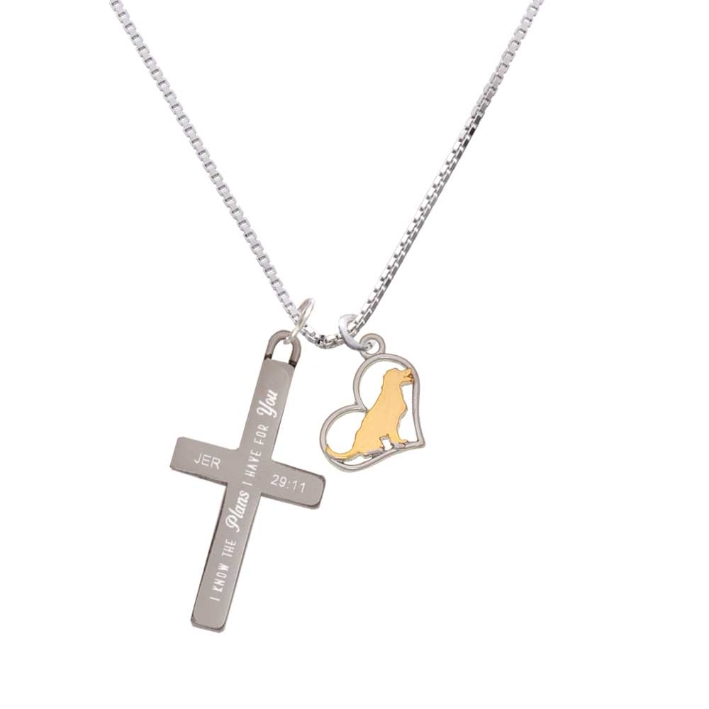 Two Tone Labrador Silhouette Heart – Plans I Have for You – Cross Necklace. Two Tone Labrador Silhouette Heart is approx. 0.7 x 0.52 x 0.09 inches (HxWxD) including loop. Labrador Retriever Dog in cutout heart is the same on both sides. 1.3mm Box Chain necklace is 18″+2″ Extender. Lobster claw clasp. Stainless Steel Cross is approx. 1.3 inches long. Engraved Bible verse Jeremiah 29:11 – For I know the plans I have for you, declares the Lord, plans to prosper you and not to harm you, plans to give you hope and a future. Please Note: Our products are lead safe, but are not intended for children 14 years and younger.